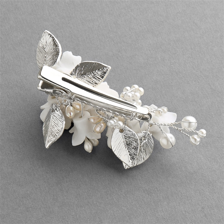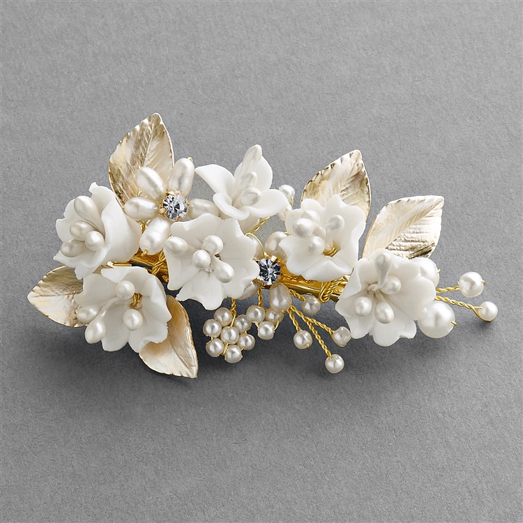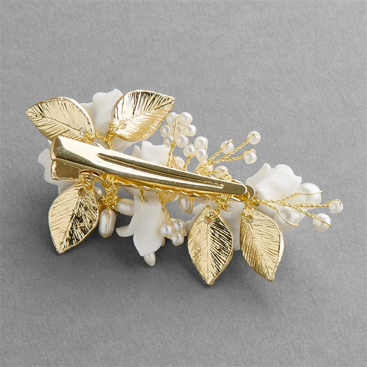 La pince à cheveux dorée de Mariell avec des fleurs en résine ivoire clair est la taille parfaite pour accessoiriser les coiffures de mariée ou de bal. Notre pince à cheveux de 7,6 cm de large x 3,8 cm de haut est plaquée en véritable jaune 14 carats et comprend des perles d'eau douce, des perles d'ivoire et des fleurs en résine ivoire clair sur une pince crocodile de 3,8 cm pour un maximum d'options de style pour s'adapter à n'importe quelle coiffure de mariée.