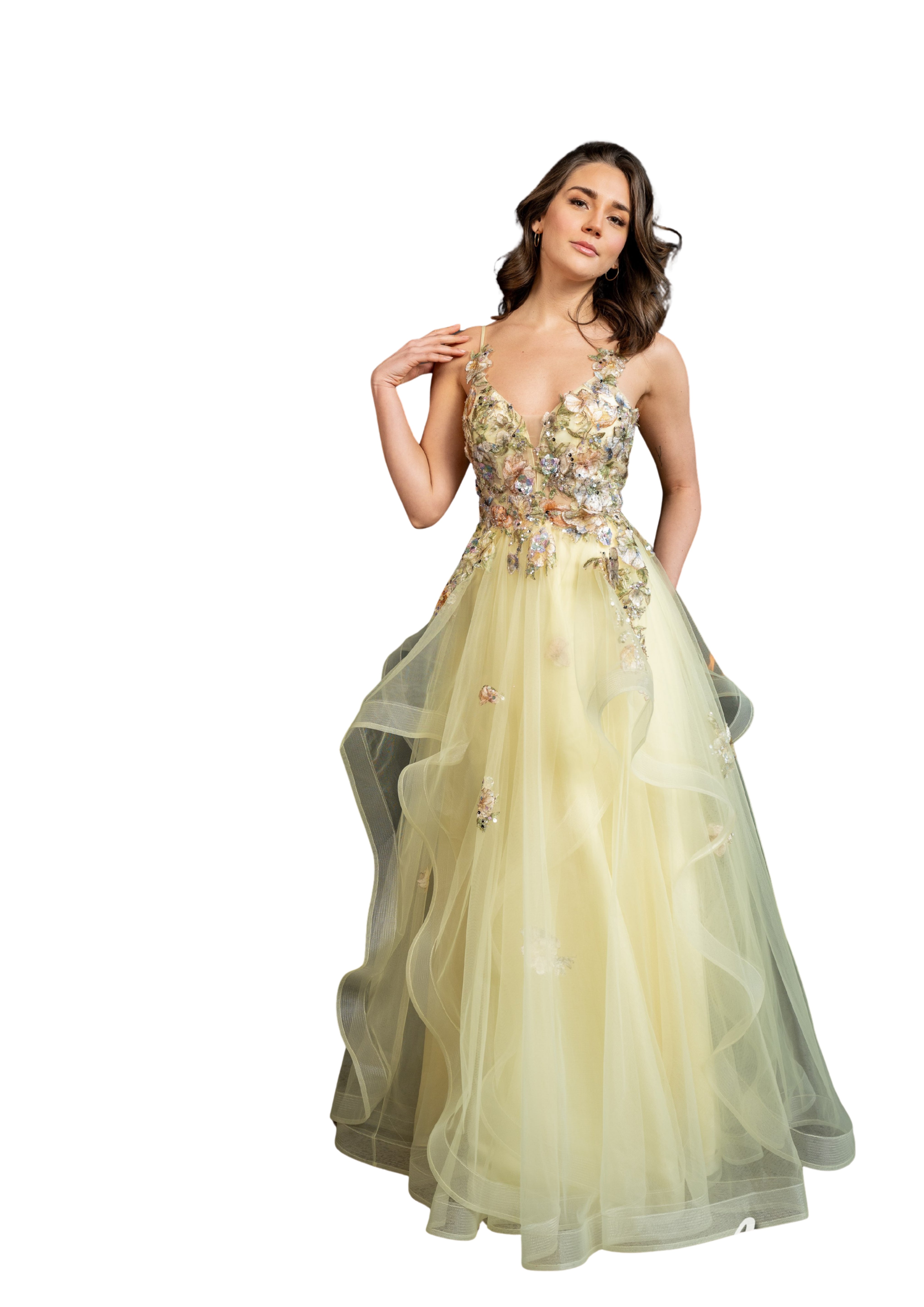 La robe A9006 enchante par son style à la fois romantique et lumineux. Son corsage à fines bretelles est richement décoré d’applications florales en relief et de perles scintillantes, créant un effet raffiné et poétique. Le décolleté plongeant apporte une touche de modernité, tandis que la jupe volumineuse en tulle léger, agrémentée de volants ondoyants et détails fleuris, évoque la grâce et la féérie d’un conte de princesses. Sa couleur jaune pastel lumineux accentue son originalité et sa fraîcheur.