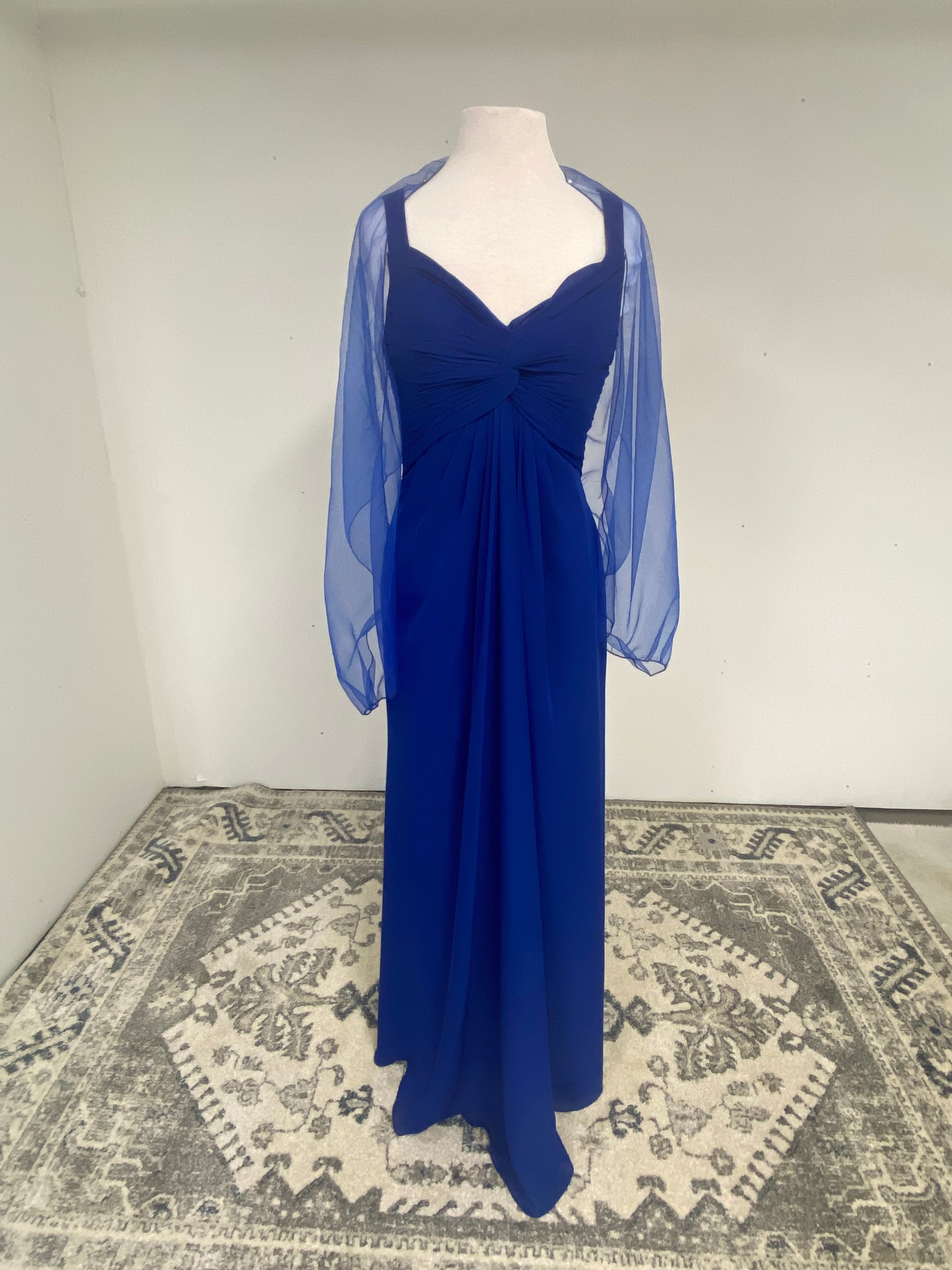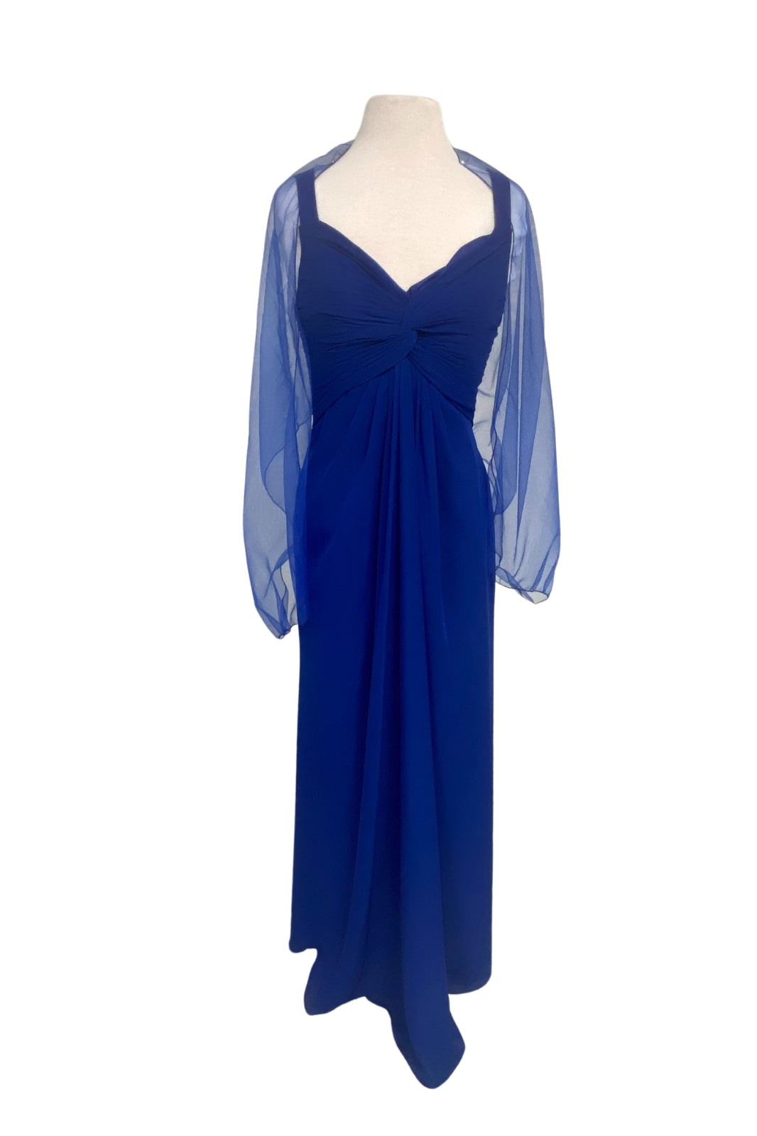 Confectionnée dans un chiffon fluide bleu royal, elle présente un corsage drapé avec un nœud central qui met en valeur la silhouette avec délicatesse.