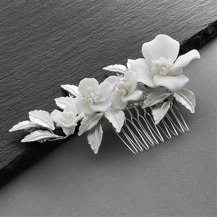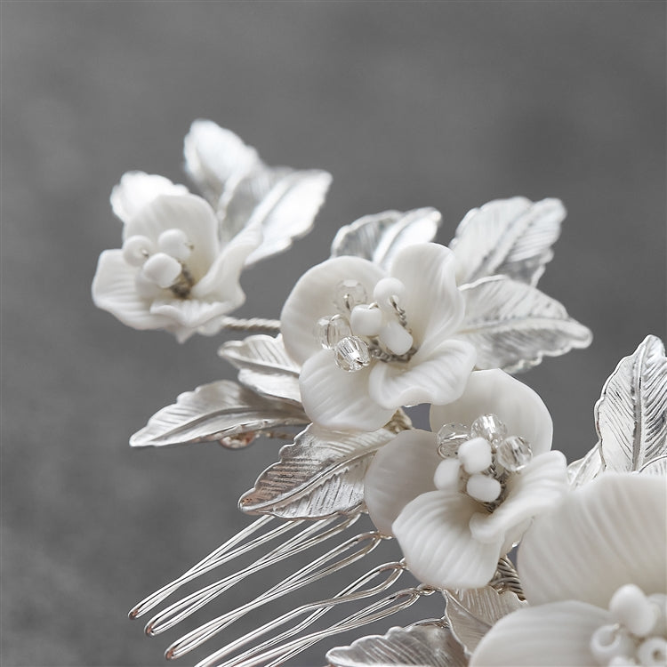 Les accessoires pour cheveux à fleurs blanc cassé avec des feuilles d'argent sont le l'ajout parfait pour accessoiriser les coiffures de mariée ou de bal. Notre peigne à cheveux de 7,6 cm de large x 3,8 cm de haut est plaqué en argent véritable et comporte des perles blanches, des cristaux et des fleurs en résine ivoire clair sur un peigne en métal flexible de 3,8 cm pour un super confort. Ajoutez cette parure de cheveux botanique à la collection d'accessoires pour cheveux de votre magasin. aujourd'hui.