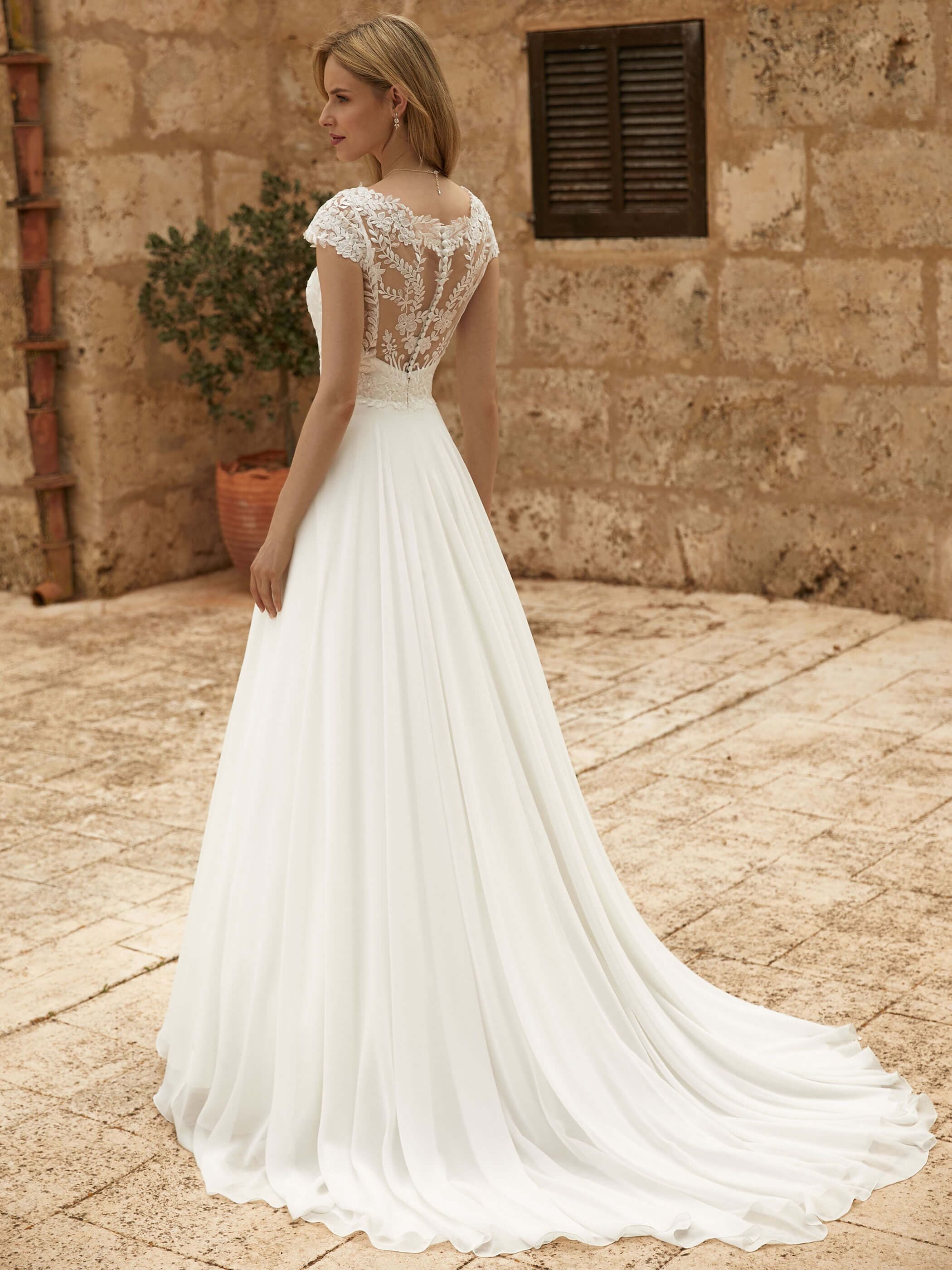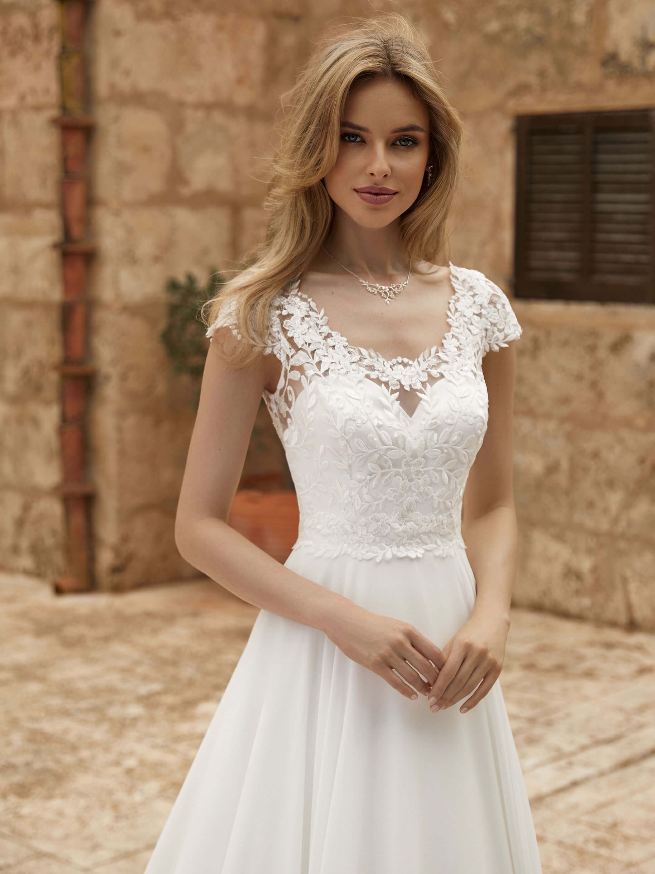 Robe de mariée trapèze en dentelle et mousseline |