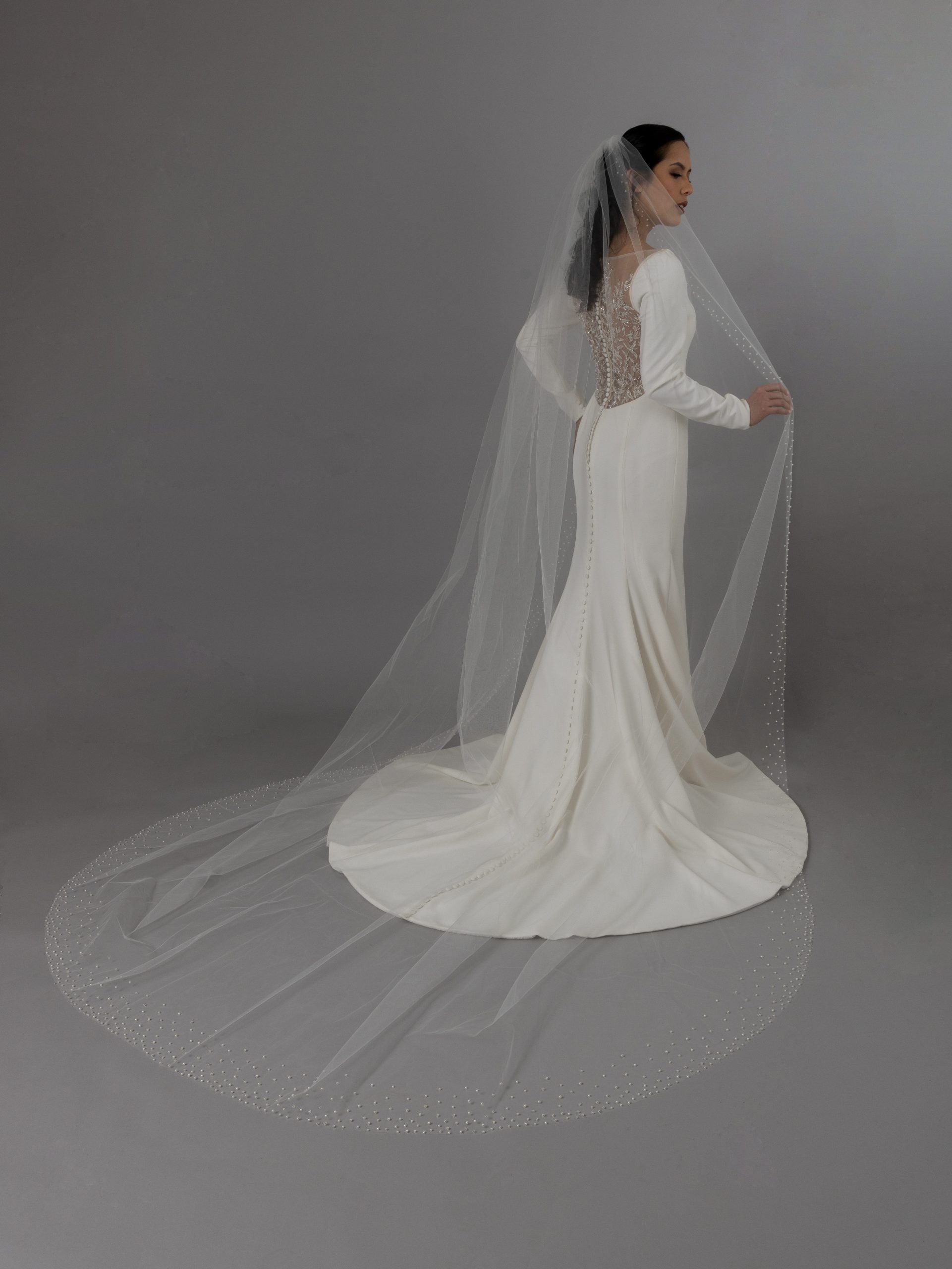 Ajoutez une touche de sophistication et d'élégance à votre robe de mariée avec ce voile à large bord de perles. Sa longueur cathédrale et son contour délicat en perles en font un accessoire sophistiqué pour un look de mariage exclusif.