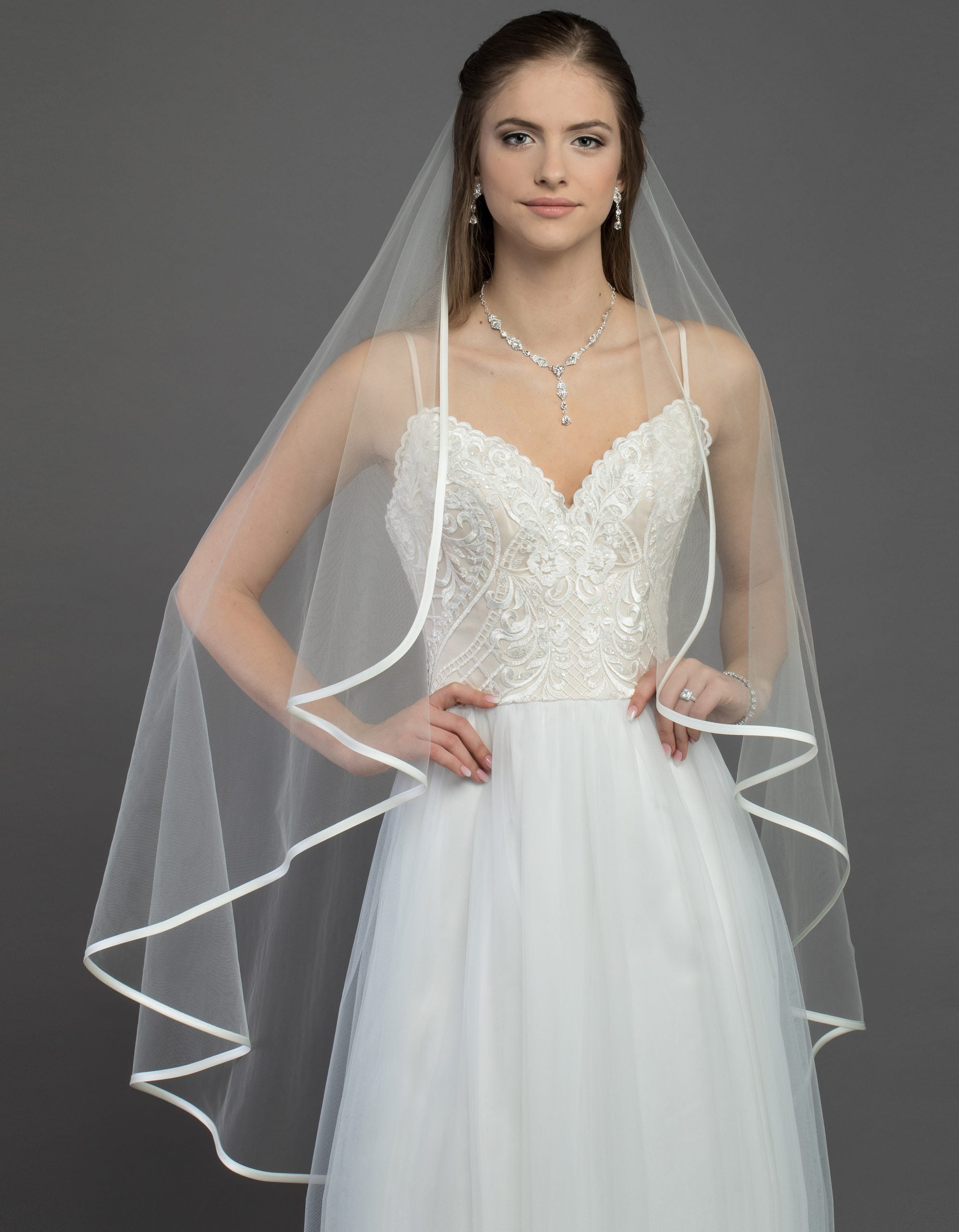 Ce voile élégant en tulle doux est l'accessoire parfait pour compléter votre tenue de mariage. Il est orné d'un ourlet satiné pour une touche raffinée et un maintien parfait. La simplicité de ce voile met en valeur la robe tout en ajoutant une dimension aérienne et gracieuse à votre look de mariée.