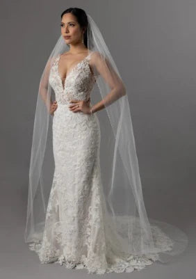 Ce somptueux voile longueur cathédrale sublime la silhouette de la mariée avec une aura de lumière et de raffinement.